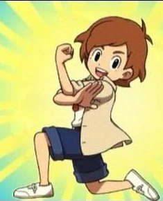 Es un chico de pelo marrón. Viste un polo beige y pantalones cortos azules. Además, tiene unas zapatillas blancas y tiene una camiseta interior de color blanco.